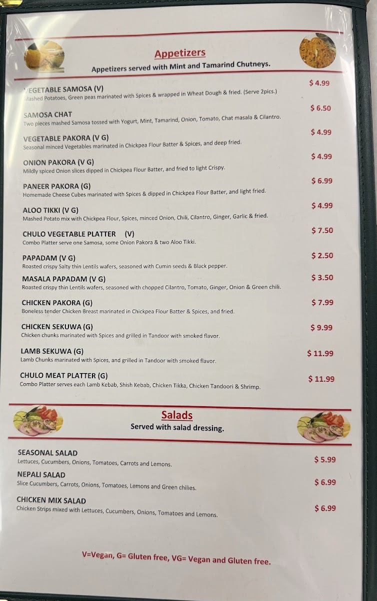 Seasonal minced Vegetables, Onions marinated in Chickpea flour batter & Spices, & fried.