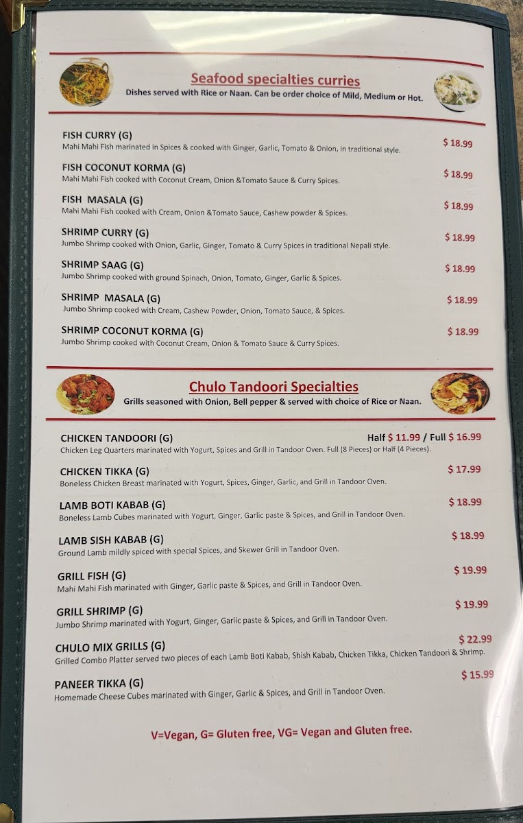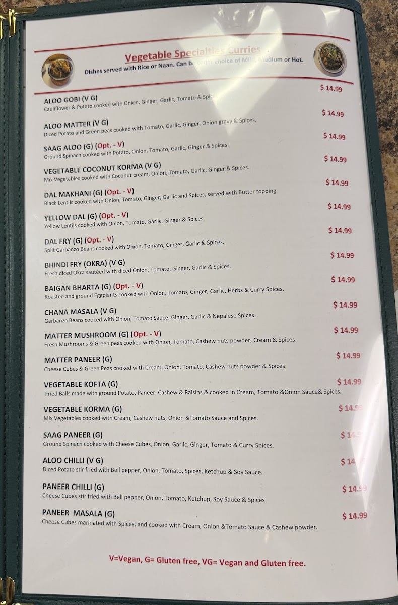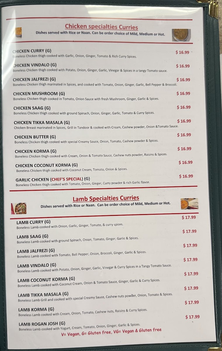 Choice of Two Meat and One Veggie Curry. MEAT: CHICKEN COCONUT KORMA, CHICKEN CURRY, BUTTER CHICKEN,LAMB CURRY, LAMB JALFREZI OR LAMB COCONUT KORMA VEGGIE: CHANA MASALA, VEG. COCONUT KORMA OR PANEER MASALA